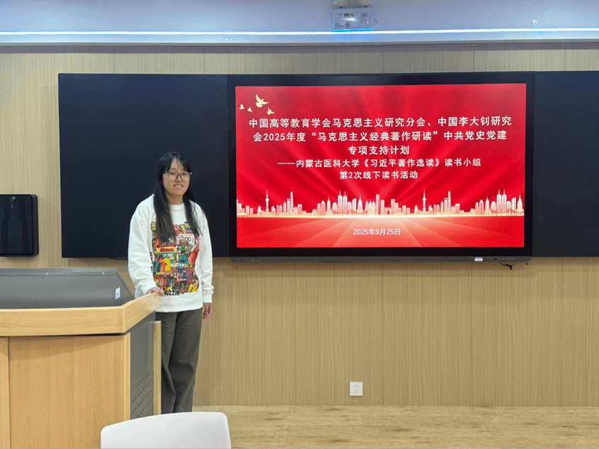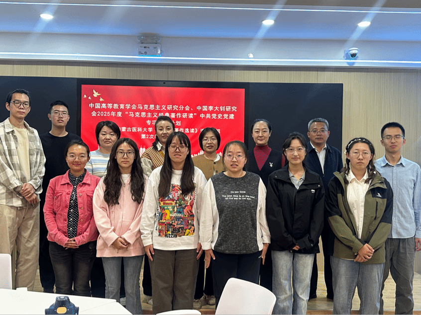 2025年9月25日中午,依托中国高等教育学会马克思主义研究分会、中国李大钊研究会2025年度"马克思主义经典著作研读"中共党史党建专项支持计划,内蒙古医科大学《习近平著作选读》读书小组第二次线下读书活动在金山校区教学南楼306室顺利举行。读书小组全体成员及多位指导教师参与活动,由贾慧杰主持。